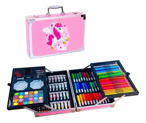 Modelo sujeto a disponibilidad de la tienda Ayuda a desarrollar la creatividad, imaginación y habilidades de tu hijo con este set de arte. Su diseño en forma de maletín lo hace ideal para llevarlo a todos lados. El set incluye 145 artículos, desde pinturas al óleo y lápices hasta pinceles donde cada objeto tiene su propio lugar. Además, está fabricado con materiales resistentes y ligeros, con asa para el transporte y cierres de seguridad. CARACTERÍSTICAS: Edad: Niños mayores a 3 años (3+). Tamaño cerrado: 34 x 23 x 8cms, abierto 78 x 23 x 14cms aprox. CONTIENE: - Lápices de Color. - Mini marcadores. - Crayolas. - Pasteles al óleo. - Acuarelas. - Lápices de dibujo. - Pinceles de diferente tamaño. - Recipientes en forma de flor. - Borrador. - Tajador. - Goma plástica.