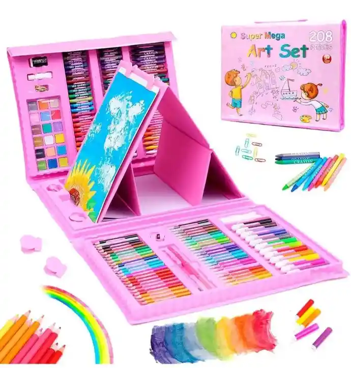 Set x208 piezas de suministros de arte en estuche plástico para niños y adolescentes principiantes. DIBUJAR O COLOREAR EN CUALQUIER LUGAR: Viene con un estuche de arte organizador portátil que es compacto y fácil de transportar. Ya sea en casa, viajando al aire libre o en cualquier otro lugar, le brinda una gran versatilidad, se convierte fácilmente en un caballete tríptico de doble cara que le permite dibujar en todas partes. Especificaciones: Material: plástico ecológico Color de la carcasa: rosado Aplicación: niños mayores de 3 años. Lista de paquetes: 48 pasteles de aceite 36 bolígrafos de acuarela 30 x Clip de papel 24 lápices de colores 24 lápices de colores 18 x tortas de acuarela 1 juego x papel A4 1 x pegamento líquido 1 x borrador 1 x sacapuntas 1 pincel 1 lápiz 1 x paleta 1 x pegamento blanco 1 x caballete de doble cara ✅Nuestros productos antes de ser enviados son probados ✅Para la garantía el producto debe mantener sus sellos y no cubre daños ocasionados por el comprador ✅La factura de compra será enviada a su correo electronico