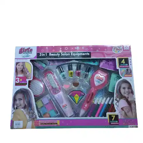 Somos Danny Toys, ofrecemos el Kit 3 en 1 para jugar al manicure para teñir el cabello y hacer tatuajes, Contiene: *4 Esmaltes. *3 Cajas de Polvo escarcha. *1 Lima. *1 Máquina de tinte para el cabello. *6 Tizas para tinte cabello. *7 Marcadores lavables para maquina de tatuaje, *2 Separadores. *8 Plantillas de Moda tatuaje. *2 Clip de Cabello. *1 Peine. *1 Manual. Requiere dos pilas AA (NO INCLUIDAS).