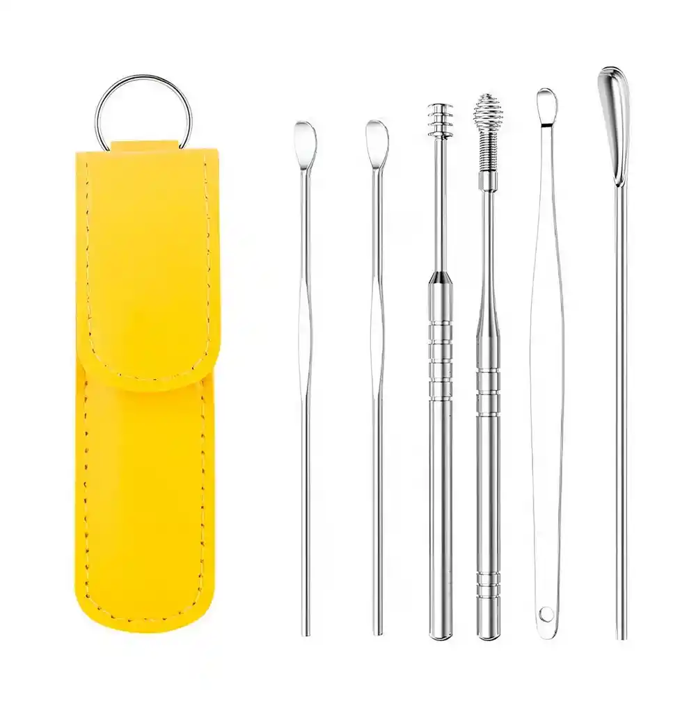 El Set Kit de Limpieza e Higiene para Oídos 6 en 1 es una solución práctica y reutilizable para mantener tus oídos limpios de forma segura y eficaz, ya que incluye herramientas de acero inoxidable de alta calidad, resistentes a la corrosión y fáciles de desinfectar. Cada limpiador cuenta con un diseño ergonómico que permite eliminar suavemente tanto la cera blanda como la dura, sin empujarla hacia el interior del oído, brindando además una agradable sensación de masaje. Incluye una herramienta con resorte y espiral que ayuda a aliviar la picazón mientras limpia. Su presentación en un estuche portátil de cuero lo convierte en una opción ideal para el uso diario, viajes o incluso como un regalo útil y elegante. Ficha Técnica: Dimensiones: 9 cm x 0.5 cm Material: Acero Inoxidable Cantidad de piezas: 6 pcs ** _Para defectos de fábrica o retractos: \_Por favor revise el producto apenas lo reciba y antes de usarlo. No aplican ley de retracto o defectos de fábrica luego de usar el producto. Se manejan máximo 5 días para reportar defectos de fábrica (por ejemplo, producto funciona mal, piezas faltantes, rotas, etc). Para hacer efectiva la devolución el producto debe devolverse con el empaque original, el cual debe estar en buen estado, incluir todos los documentos y las partes completas y sin daño