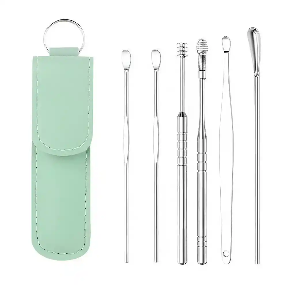 El Set Kit de Limpieza e Higiene para Oídos 6 en 1 es una solución práctica y reutilizable para mantener tus oídos limpios de forma segura y eficaz, ya que incluye herramientas de acero inoxidable de alta calidad, resistentes a la corrosión y fáciles de desinfectar. Cada limpiador cuenta con un diseño ergonómico que permite eliminar suavemente tanto la cera blanda como la dura, sin empujarla hacia el interior del oído, brindando además una agradable sensación de masaje. Incluye una herramienta con resorte y espiral que ayuda a aliviar la picazón mientras limpia. Su presentación en un estuche portátil de cuero lo convierte en una opción ideal para el uso diario, viajes o incluso como un regalo útil y elegante. Ficha Técnica: Dimensiones: 9 cm x 0.5 cm Material: Acero Inoxidable Cantidad de piezas: 6 pcs ** _Para defectos de fábrica o retractos: \_Por favor revise el producto apenas lo reciba y antes de usarlo. No aplican ley de retracto o defectos de fábrica luego de usar el producto. Se manejan máximo 5 días para reportar defectos de fábrica (por ejemplo, producto funciona mal, piezas faltantes, rotas, etc). Para hacer efectiva la devolución el producto debe devolverse con el empaque original, el cual debe estar en buen estado, incluir todos los documentos y las partes completas y sin daño