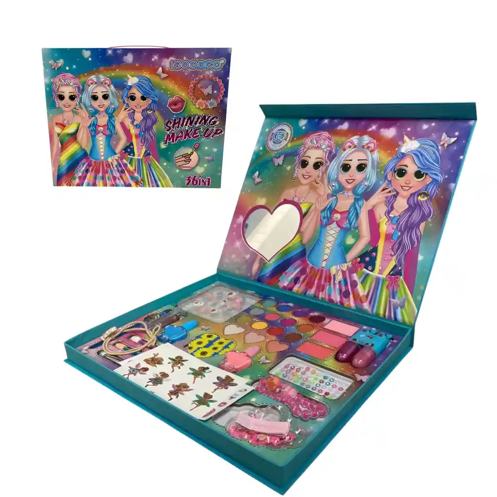 ***¡¡BIENVENIDO A ATARISTATION!!*** 1. CARACTERISTICAS DE LA COMPRA: 1.1 Esta compra incluye: Kit Maquillaje Para Niñas: - Sombras - Lapiz - Labial - Brochas de sombras 1.2 Características del producto: Este encantador set de maquillaje y accesorios está diseñado para que las niñas desarrollen su imaginación mientras juegan a crear estilos propios. Su presentación tipo “caja mágica” ofrece una combinación de maquillaje infantil y accesorios de belleza organizados de forma atractiva, ideal para juegos de salón y momentos de creatividad. El estuche incluye colores brillantes y suaves pensados para el juego seguro, además de una variedad de complementos que permiten experimentar con peinados y looks diferentes. Todo está dispuesto en compartimentos internos que mantienen el orden y facilitan la diversión. Perfecto para actividades de rol, juegos entre amigas y como regalo especial para pequeñas que disfrutan de la moda y la fantasía.
