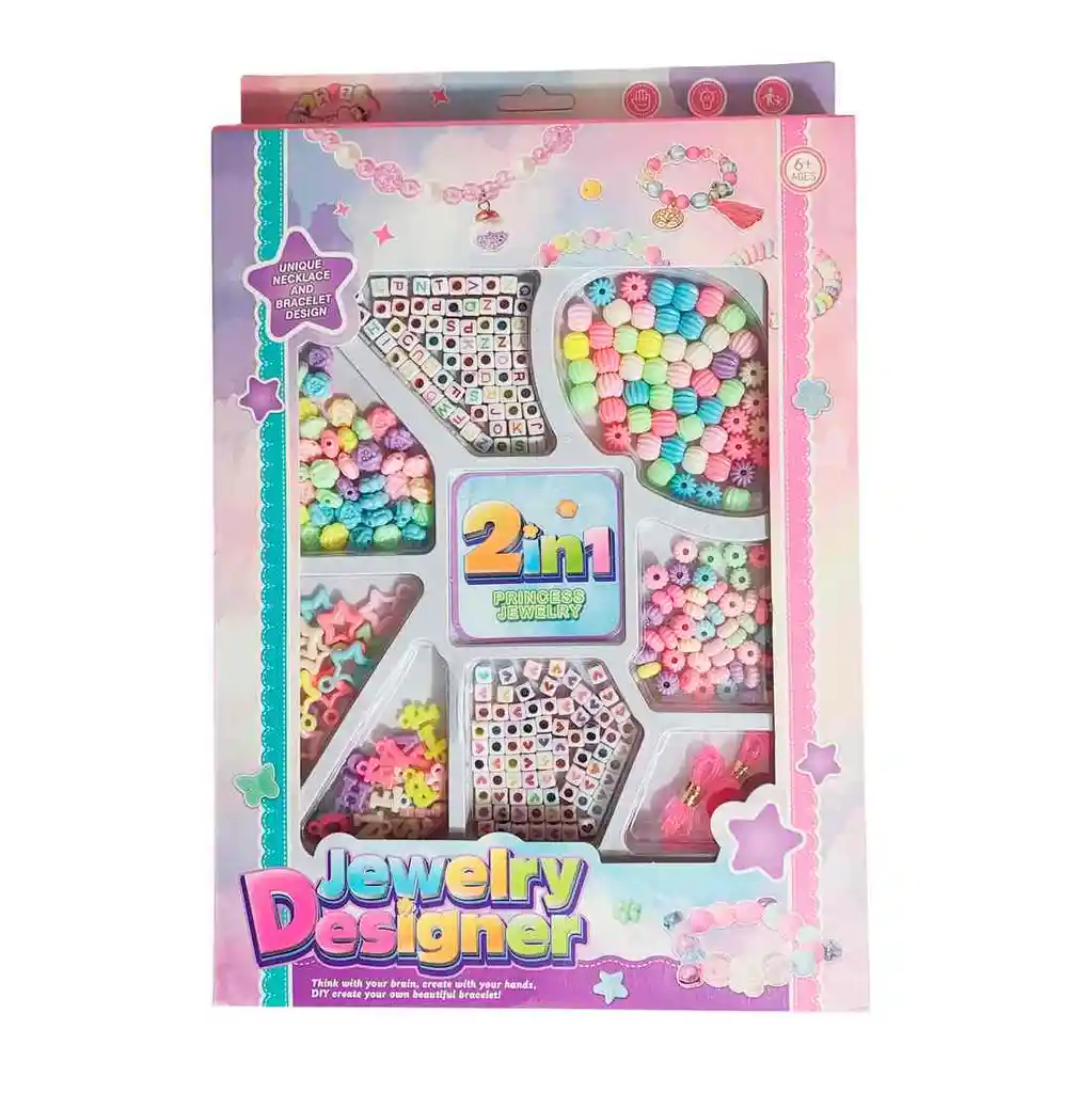 El set Jewelry Designer 2 en 1 es ideal para que las niñas den rienda suelta a su imaginación creando collares y pulseras únicas, ya que incluye cuentas de colores, formas variadas y accesorios divertidos para diseñar joyas personalizadas; una actividad creativa y entretenida que fomenta la motricidad fina y asegura horas de diversión mientras elaboran sus propios estilos. Ficha Técnica: Dimensiones empaque : 33 cm x 22 cm x 3 cm Material: Plástico ABS no toxico Edad recomendada + 6 Años Referencia: 43 Certificado de conformidad: CS-LCO-13233-2021S2/432 ** _Para defectos de fábrica o retractos: \_Por favor revise el producto apenas lo reciba y antes de usarlo. No aplican ley de retracto o defectos de fábrica luego de usar el producto. Se manejan máximo 5 días para reportar defectos de fábrica (por ejemplo, producto funciona mal, piezas faltantes, rotas, etc). Para hacer efectiva la devolución el producto debe devolverse con el empaque original, el cual debe estar en buen estado, incluir todos los documentos y las partes completas y sin daños.