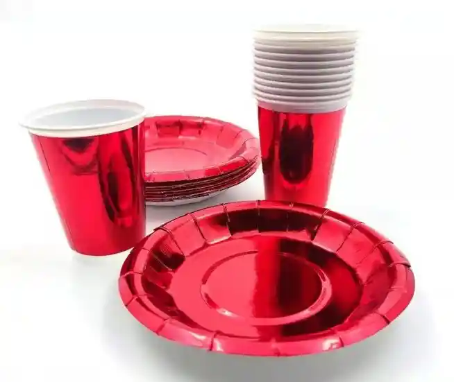 Set - Kit Platos Y Vasos Color Rojo Metalizado X10 Unidades