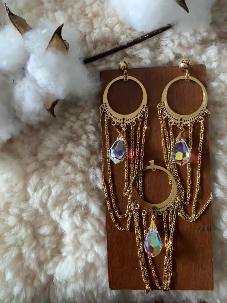 Set Dije+Aretes Largo Lágrima Tiras con Swarovski Transparente, Diseño Exclusivo en Herraje Goldfilled 1420. El GoldFilled 1420 Se fabrica combinando capas de aleación de oro de 14 kt con un metal base - generalmente de latón. Tiene un enchape 50 veces más gruesa que el baño galvanoplastia en oro normal. Mediante la combinación de capas de aleación de oro sobre un metal de base (por lo general de latón) se enrollan con el grosor y forma deseados. Los Herrajes son conocidos por su durabilidad y puede ser usada sin reacciones ni dificultades en la mayoria de personas
