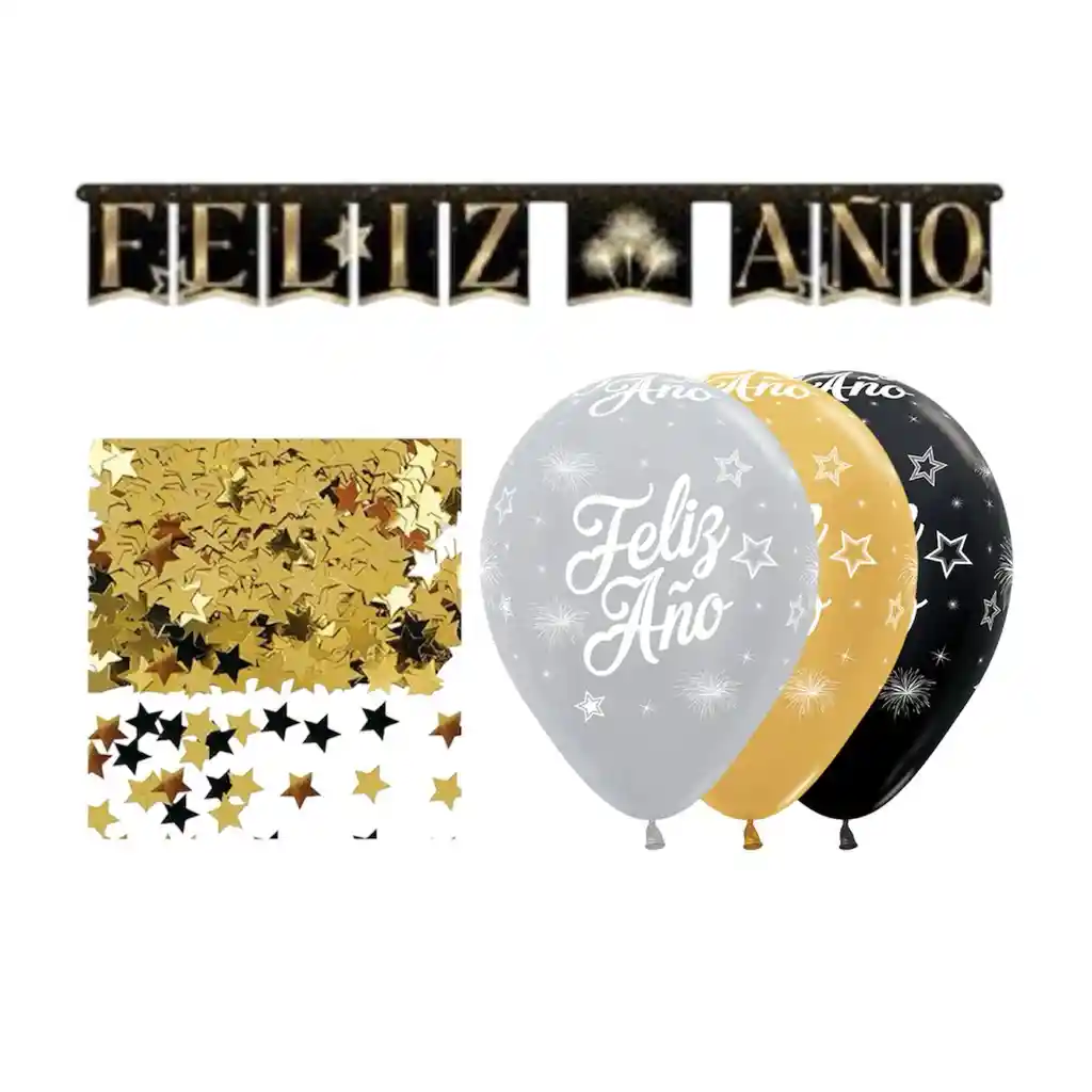 Set Año nueov ue contiene Letrero de 1.14m de largo y dice Feliz Año Confeti de estrellas doradas Globos x50und plateadas doradas y negras que dicen Feliz Año Nuevo Para tu nuevo año