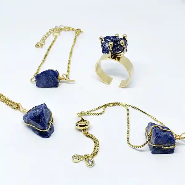 El lapislázuli ayuda a liberar rápidamente el estrés, aportando una paz profunda. Es un poderoso amplificador del pensamiento, aporta claridad y objetividad, armoniza los niveles físico, emocional, mental y espiritual, proporcionando un profundo conocimiento interno cuando están equilibrados. Esta es una imagen referencia. El tono, la forma y el tamaño de los cristales pueden variar. Material pulsera: Rodio Material Collar y tobillera: Acero inoxidable Material aretes y anillo: Latón con baño de oro 24K INCLUYE: Collar + manilla + tobillera