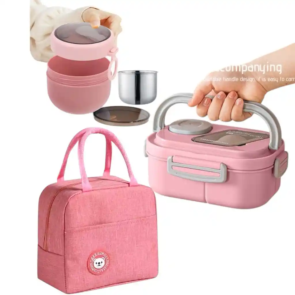 1 Lonchera Con Aislamiento Termico Interno 1 Taza redonda De Aislamiento De Tazón Sopa De Acero Inoxidable Rosa. 1 porta comidas premium Ideal para llevar tus comidas ,onces Estudiantes Trabajo Salidas Color rosado