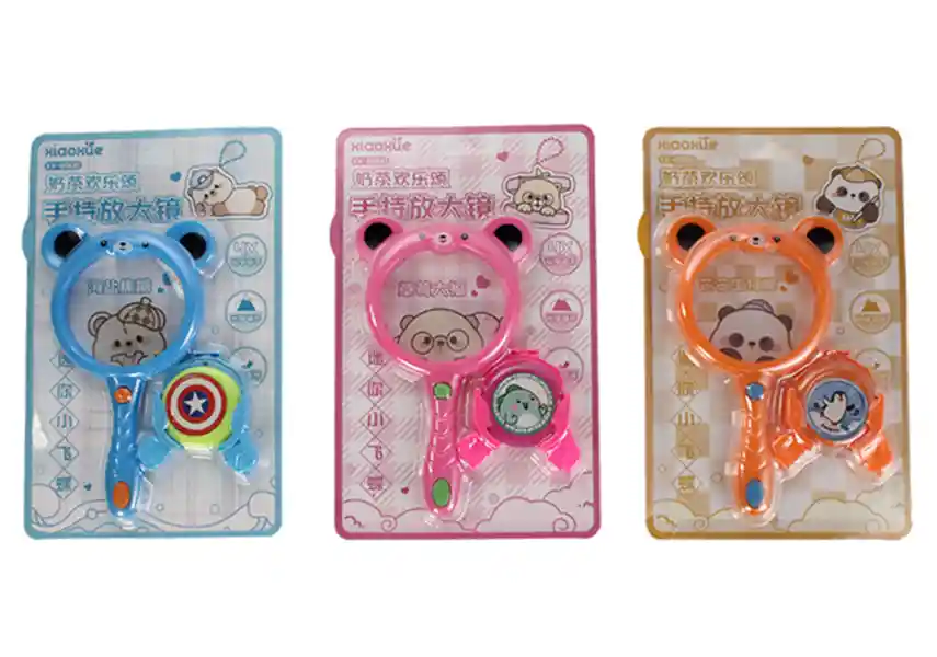 Color y diseño aleatorio según disponibilidad de inventario. El set incluye una lupa funcional y un accesorio lanzador de tazos. Viene en motivos surtidos, generalmente con diseños de personajes o temáticas infantiles populares.