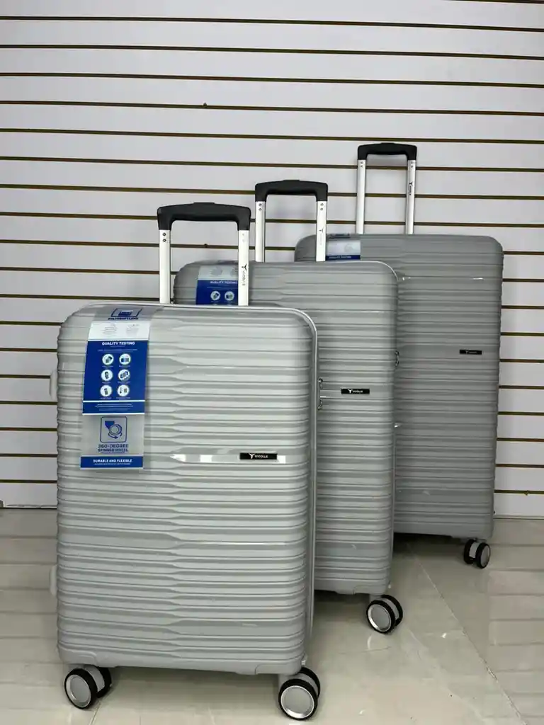 Set de 3 maletas de viaje rígidas color gris oscuro, fabricadas en polipropileno de alta resistencia, ideales para proteger tus pertenencias en cualquier trayecto. Incluye tres tamaños: grande (70 x 40 x 41 cm), mediana (60 x 42 x 37 cm) y pequeña (50 x 36 x 23 cm), perfectas para viajes largos, medianos o de mano. Cuentan con candado de seguridad integrado para mayor protección, forro interno contramarcado que brinda mejor organización y estructura, y sistema de manija ajustable con asas reforzadas para un manejo cómodo. Sus 4 ruedas giratorias 360° permiten un desplazamiento suave y sin esfuerzo en cualquier dirección. Diseño moderno con acabado texturizado que ayuda a reducir rayones, combinando durabilidad, funcionalidad y estilo en cada viaje. Precio del set por las tres piezas.