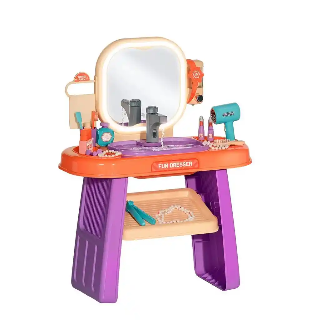 ¡El sueño de toda pequeña estrella se hace realidad con nuestro encantador tocador y lavamanos multifuncional, un completo centro de belleza y juego! Este no es un tocador cualquiera; cuenta con un espejo que se ilumina mágicamente con un solo toque y un innovador lavamanos con un grifo que funciona de verdad, ofreciendo una experiencia de juego increíblemente realista. El set viene súper equipado con un arsenal de accesorios para desatar la creatividad: secador y plancha de pelo, cepillo, labiales de juguete, elegantes collares y anillos, perfume y hasta su propio set de cuidado dental. Es el regalo perfecto para inspirar horas de juego imaginativo, fomentar la independencia y permitir que tu pequeña se divierta mientras explora su propio estilo en su rincón de glamour personal. Ficha Técnica: Dimensiones empaque : 70 cm x 55 cm x 9 cm Material: Plástico ABS Funcionamiento: 6 Baterías AA ( Incluidas ) Edad Apta : + 3 años Certificado de conformidad: SL-CS-210044 Referencia: 008-959 ** _Para defectos de fábrica o retractos: \_Por favor revise el producto apenas lo reciba y antes de usarlo. No aplican ley de retracto o defectos de fábrica luego de usar el producto. Se manejan máximo 5 días para reportar defectos de fábrica (por ejemplo, producto funciona mal, piezas faltantes, rotas, etc). Para hacer efectiva la devolución el producto debe devolverse con el empaque original, el cual debe estar en buen estado, incluir todos los documentos y las partes completas y sin daños.