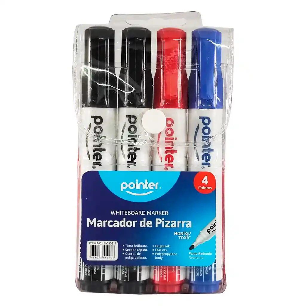 set de marcadores borrables pointer para tablero x 4 unidades. colores negro, azul y rojo Somos Bocetos Papelería. Empresa Santandereana, ubicados en Bucaramanga, con más de 40 años en el mercado, orgullosos de ser distinguidos en el ámbito comercial, por cumplir a cabalidad nuestra mayor política: brindar siempre y en todo momento una experiencia de satisfacción total a las necesidades de nuestros clientes. -incluye: 2 marcadores negros, 1 marcador azul y 1 marcador rojo -marcador de punta redonda -Escritura suave sobre la pizarra y de fácil borrado. -Marcador para tablero blanco con tapa con clip -No deja manchas. -Óptimo para el colegio y la oficina, casi imperceptible al olfato. -Ideales par tableros blancos y superficies similares -No toxico -sin xileno bajo olor -tinta brillante -secado rápido -cuerpo de polipropileno