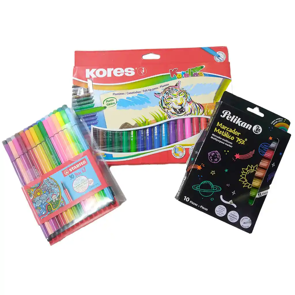 Set de Plumones y marcadores x 3 cajas en colores surtidos el set contiene: Set de Plumones Lavables x 20 + 2 Lapiceros k5-m Kores KORELLOS Plumones ergonómicos con puntas cónicas y resistentes. -Ideales para colorear y dibujar , para uso escolar -Con tapa anti - asfixiante - Colores intensos. CONTENIDO DEL EMPAQUE - 30 plumones Stabilo en colores. DETALLES DEL PRODUCTO - Rotulador de alta calidad con punta de fibra e intensos colores para trazos fuertes y amplias zonas a colorear. - Pigmentos seleccionados con gran brillo y luminosidad. Estuche x 10 Marcadores Metálicos 752 Pelikan en colores surtidos. - Marcador con innovadora tinta metalizada. - Ideal para superficies oscuras colores intensos y brillantes - Es permanente en superficies porosas. - Se elimina con facilidad en superficie lisa (no porosa).