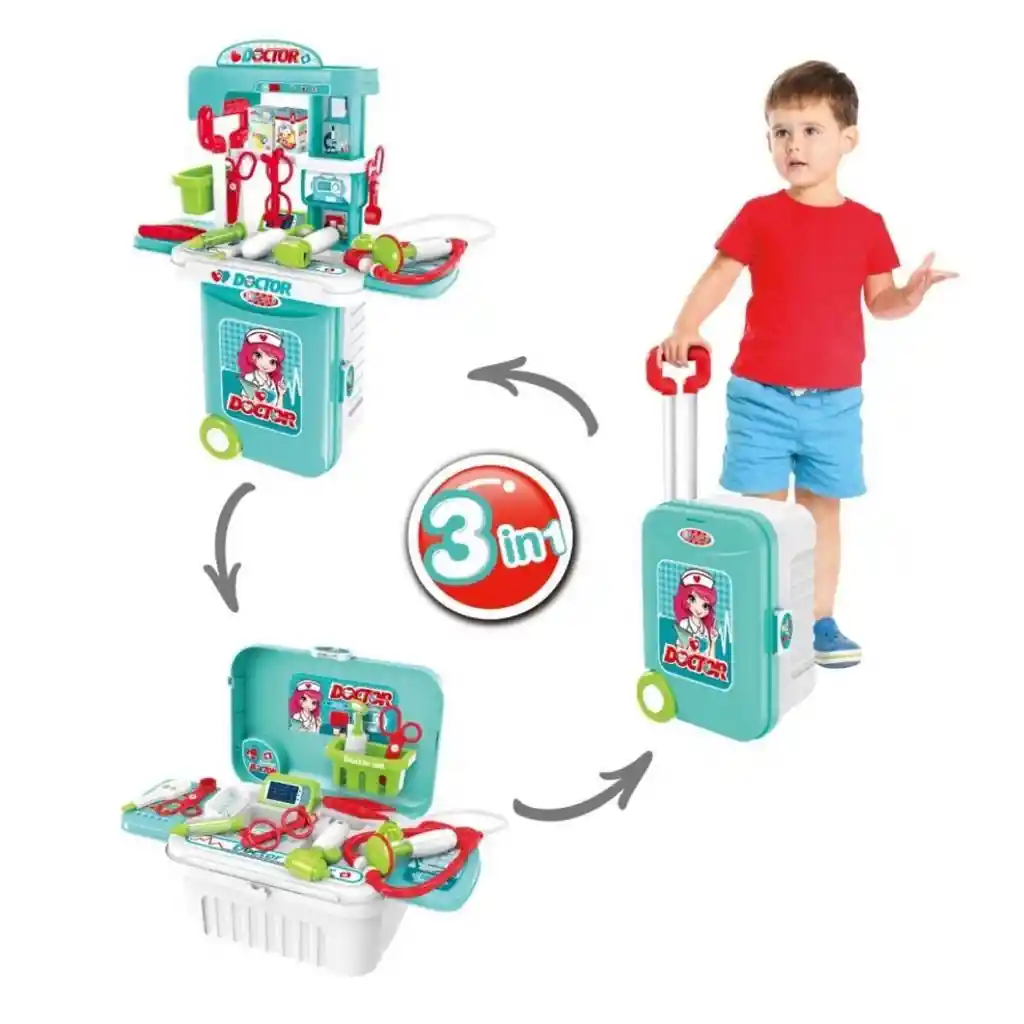 Somos TELEPRODUCTOS BOGOTA Productos 100% garantizados, años de experiencia en ventas online.! -Cuando realices la compra recibirás toda la información de contacto y datos para que puedas hacer seguimiento a tu producto.! ---------------------------------------------------------------------------------------------------------------------- Set Medico Maleta Doctor Juguete Didáctico Ruedas Gracias a este precioso set de doctor dejar a los niños volar su imaginación e incentivar el juego creativo es mucho más fácil. Ellos reconocerán los utensilios básicos de la medicina mientras aprenden sobre sus funciones. Su diseño portátil lo convierte en el juguete perfecto para llevarlo a donde desees sin que se convierta en una complicación. Su instalación es 3 en 1 para que la diversión nunca se acabe y se convierta en ¡el mejor doctor del mundo! «« CARACTERÍSTICAS PRINCIPALES »» --Podrás llevarlo sobre ruedas haciendo fácil el transporte --Fácil de montar, transportar y almacenar. --Medidas: 66cmx21cmx50cm --juguete educativo de juego de roles que fomenta la imaginación y ayuda a los niños a familiarizarse con los instrumentos médicos. --El diseño portátil: permite guardarlo y transportarlo fácilmente a cualquier lugar. --El set incluye: varios accesorios médicos de juguete, como un estetoscopio, un termómetro y una jeringa, que simulan equipos reales. Este tipo de juguete es ideal para niños de 3 a 7 años.