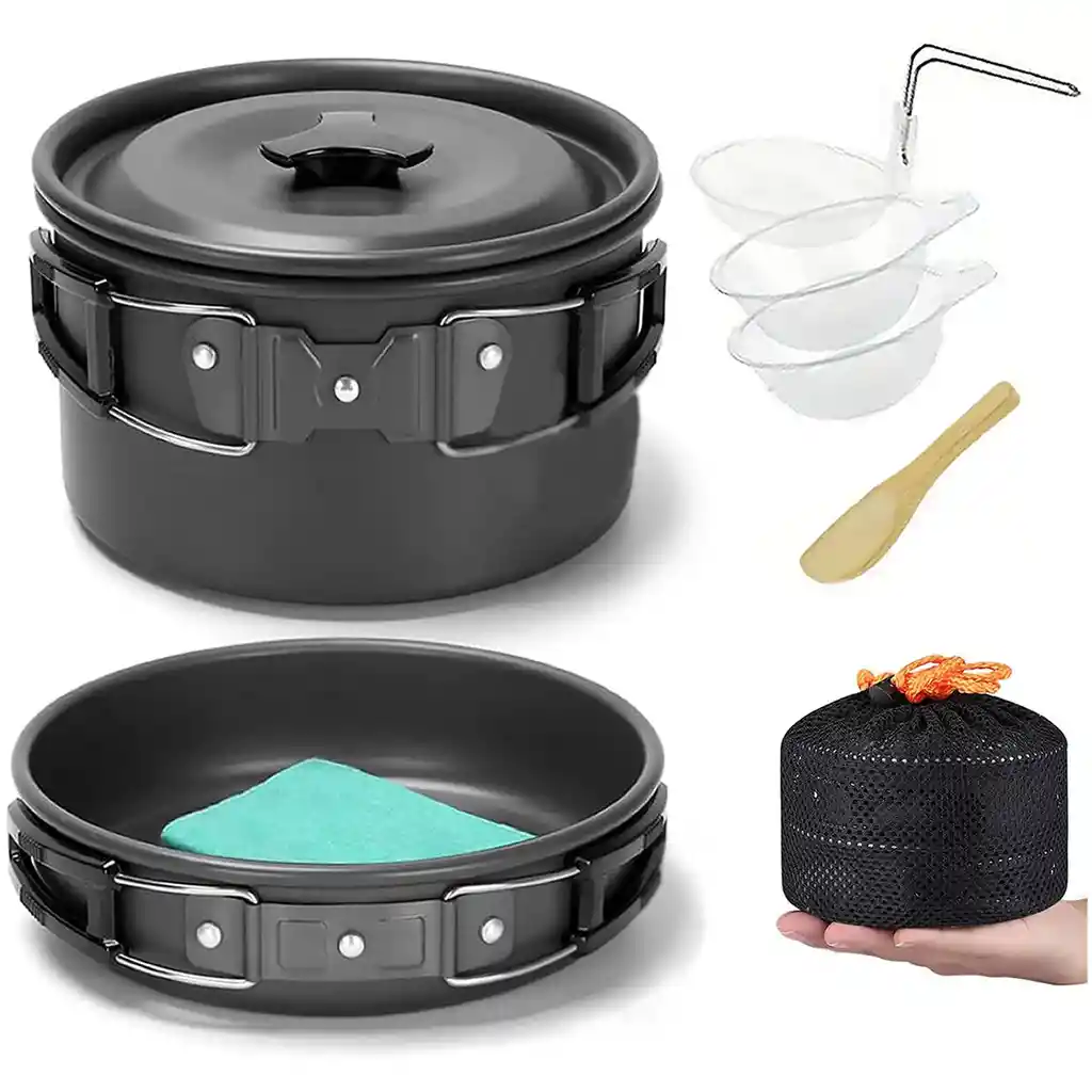 Este juego de cocina al aire libre está diseñado para una o dos personas. - La olla y la sartén están hechas de aluminio anodizado, lo que lo hace sólido y liviano.Tamaño pequeño y portátil. Y todos los objetos en este juego de cocina se pueden almacenar juntos en una bolsa para llevarlos cómodamente. -Tapa de la olla: la tapa de la olla ayuda a absorber el calor y la humedad, mejorar la eficiencia de cocción y mejorar el efecto de cocción. El juego de utensilios de cocina distribuye y retiene eficazmente el calor. -Multifuncional y ampliamente compatible: es muy adecuado para todo tipo de estufas, estufas de gas de camping, estufas de gas portátiles, fogatas, estufas de leña, etc., conveniente y rápido, adecuado para senderismo al aire libre.