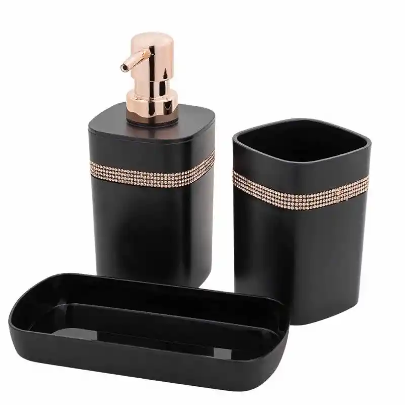 Composición del set: incluye un dispensador de jabón (líquido), un portacepillos y una jabonera para barra. Material: Los materiales comunes para estos sets incluyen cerámica, metal, Zamak o acero inoxidable, lo que les otorga durabilidad y resistencia. Color y acabado: El acabado es en negro, a menudo descrito como negro mate o "bold", para un aspecto moderno y sofisticado. Diseño: Cuentan con un diseño contemporáneo, a veces con detalles decorativos como la banda brillante visible en la imagen. Uso: Ideal para mantener el baño ordenado y organizado, también se puede utilizar en cocinas u áreas de lavado. Dimensiones aproximadas: Las dimensiones pueden variar según el fabricante, pero un set similar podría tener un ancho de aproximadamente 9.2 cm y un alto de 13.5 cm.