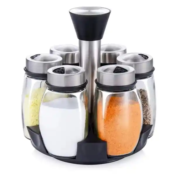 Características principales: Organización versátil: Ideal para organizar la cocina, baño, sala de estar u oficina, añadiendo estilo y funcionalidad. Especiero práctico: Facilita la cocción y mantiene los condimentos al alcance de la mano. Material de calidad: Fabricado con acero inoxidable y vidrio, combinando durabilidad y diseño moderno. Diseño compacto: Carrusel giratorio de 17,5 x 15 cm, perfecto para ahorrar espacio en cocinas contemporáneas. Capacidad: Cada frasco tiene capacidad para 120 ml o 160 ml, ideal para almacenar una variedad de especias. Protección y seguridad: Los frascos y la rejilla están diseñados para evitar rayones, garantizando un uso seguro para toda la familia. Especificaciones: Material: Acero inoxidable + vidrio Tamaño: 17,5 x 15 cm Capacidad de los tarros: 120 ml y 160 ml Peso: 1600 g Incluye: 6 tarros de condimentos 1 estante giratorio Beneficios adicionales: Diseño elegante que combina con cualquier estilo contemporáneo de cocina., Facilita el acceso rápido a tus especias mientras cocinas., Perfecto para mantener tu cocina ordenada y estilizada.