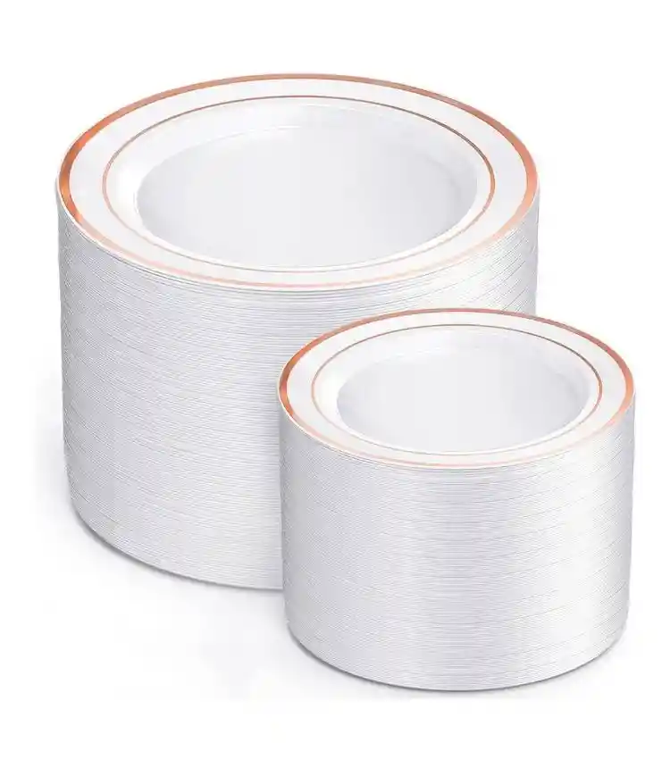 PLATOS PLASTICOS DE LUJO BLANCO BORDE ORO ROSA X 12 UNDS, CONTIENE 6 PLATOS 18 CMS Y 6 PLATOS 26 CMS. ELABORADOS EN PLASTICO REUTILIZABLE DE GRADO ALIMENTICIO LIBRE 100 % DE BPA. NO INCLUYE CUBIERTOS