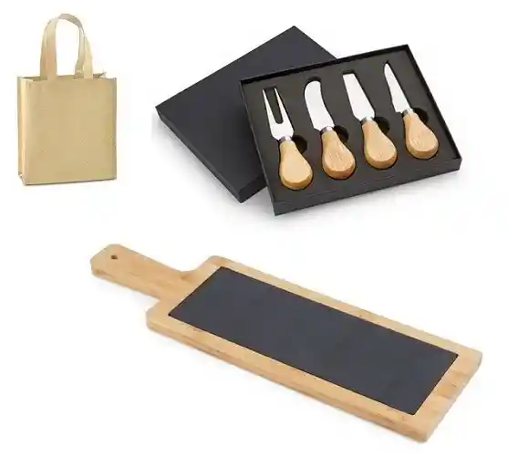 Set palas y cuchillos para quesoS, 4 utensilios en estuche. Material: Acero inoxidable + Roble. Estuche 18,8 x 15,8 x 2,4 cm. Cuchillo plano: 12,7 x 1,5 cm. Idem aprox otros Tabla para quesos ó postres en piedra pizarra y base en bambú con mango. Lavar con agua y jabón y secar al aire libre. Material: Piedra pizarra + Bambú. Medidas: 12 x 40 x 1,4 cm. Nota No incuye queso / quesos. En bolsa especial