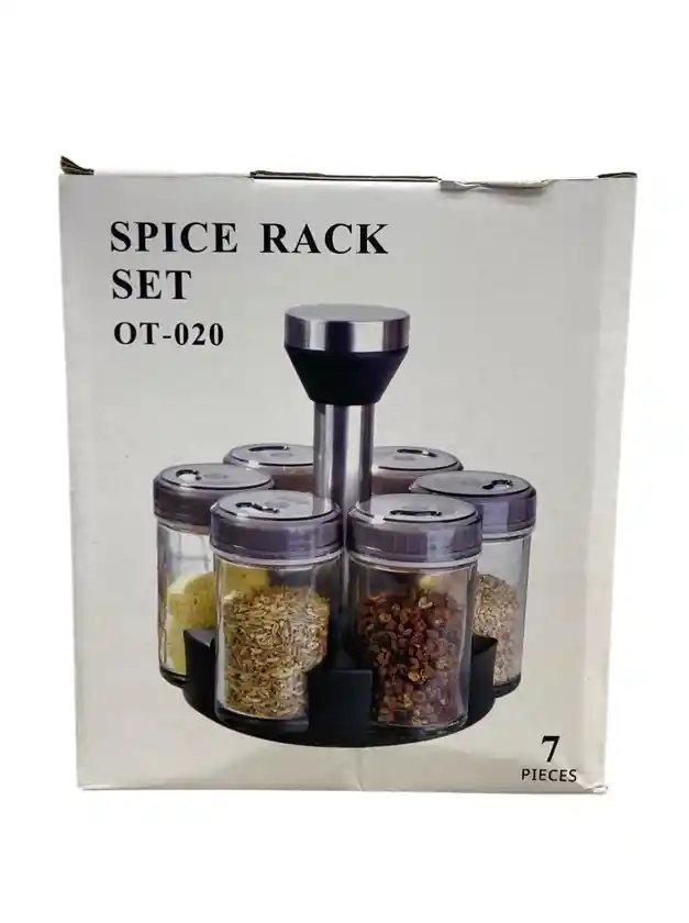 Características Principales: Organización: Ideal para almacenar y organizar especias, hierbas y condimentos en la cocina. Funcionalidad: Cuenta con una base giratoria de 360° que permite un acceso fácil y rápido a cualquiera de los frascos. Componentes: El set incluye 6 frascos de vidrio con tapas y una base central (lo que suma 7 piezas en total). Materiales: Los frascos suelen ser de vidrio transparente para ver el contenido, con tapas que pueden ser de acero inoxidable o plástico, y la base también suele ser de materiales mixtos para resistencia y diseño moderno. Diseño: Su diseño compacto y moderno ahorra espacio en la encimera y se integra bien en cualquier estilo de cocina.