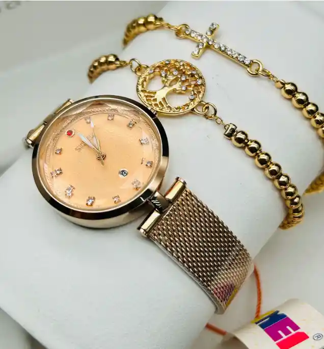 ¡Conjunto de elegancia y funcionalidad para la mujer contemporánea! Este exclusivo set presenta un reloj analógico Skmei Original junto con dos pulseras a juego, un accesorio imprescindible para realzar cualquier atuendo. El reloj, con una resistencia al agua que garantiza su durabilidad en entornos cotidianos, ofrece una excepcional calidad y estilo. Su resistencia al agua, aunque no está diseñado para inmersiones en el mar o piscinas con alto grado de cloro, garantiza su protección en situaciones diarias. El diseño de pulso en acero macizo brinda resistencia y durabilidad, mientras que su calendario funcional asegura mantenerse al tanto de fechas importantes con facilidad y estilo. ¡Y eso no es todo! Este set incluye una caja original que añade un toque de sofisticación al presentar o regalar este magnífico conjunto. Perfecto para cualquier ocasión, desde reuniones formales hasta salidas informales. Sé la envidia de todas con este set que combina la elegancia clásica con la practicidad moderna. Ideal para las mujeres que aprecian la calidad, el estilo y la funcionalidad en un solo accesorio.