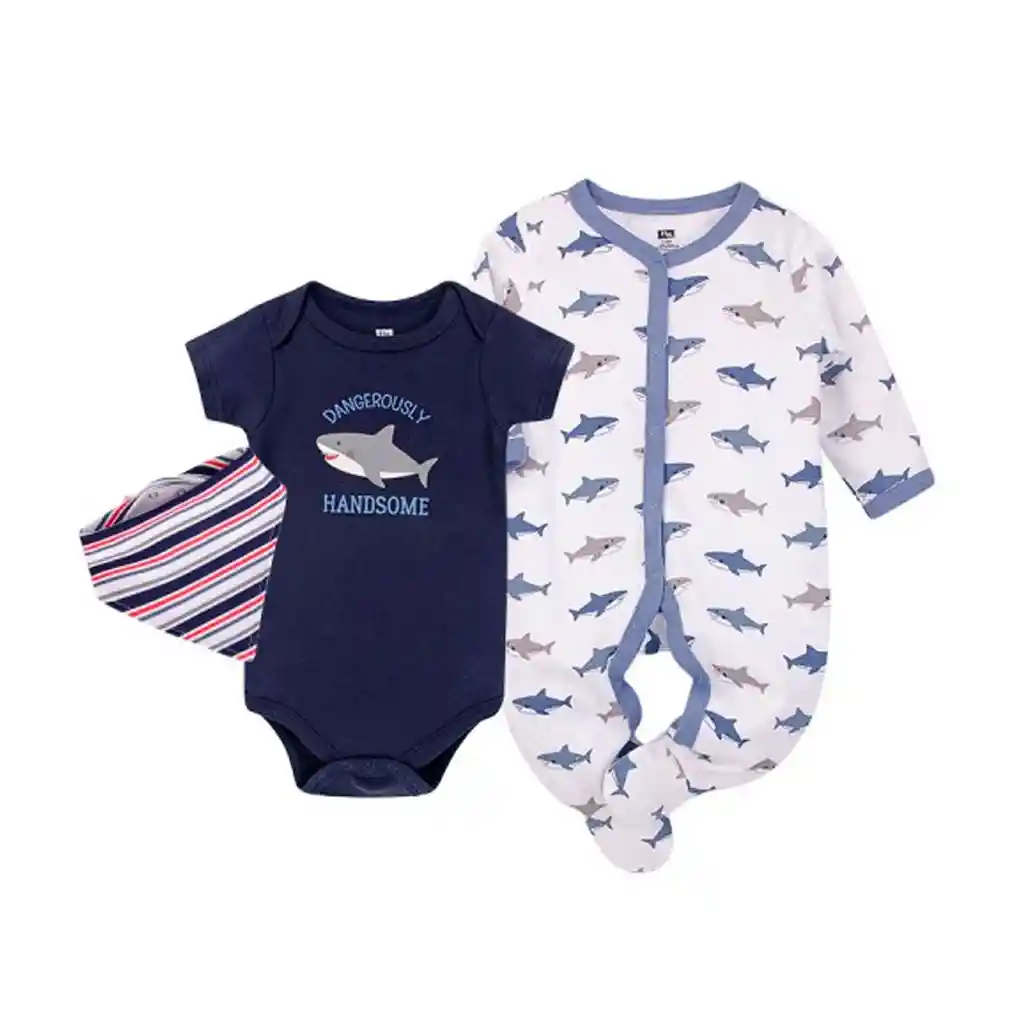Disfruta de este cómodo set de pijamas con estampado de dinosaurios para tu bebé. Incluye mameluco manga larga con medias, mameluco manga corta y bandana, todo en tela transpirable y antialérgica - de Hudson Baby. ¡Tu bebé se mantendrá cómodo y seguro mientras duerme! Características: 100% algodón Práctico pack de 3 piezas que contiene mameluco manga larga con medias, mameluco manga corta y bandana Estampados y letras adorables. Cuello envolvente que se estira fácilmente sobre la cabeza del bebé. Broches sin níquel para cambiarlos fácilmente