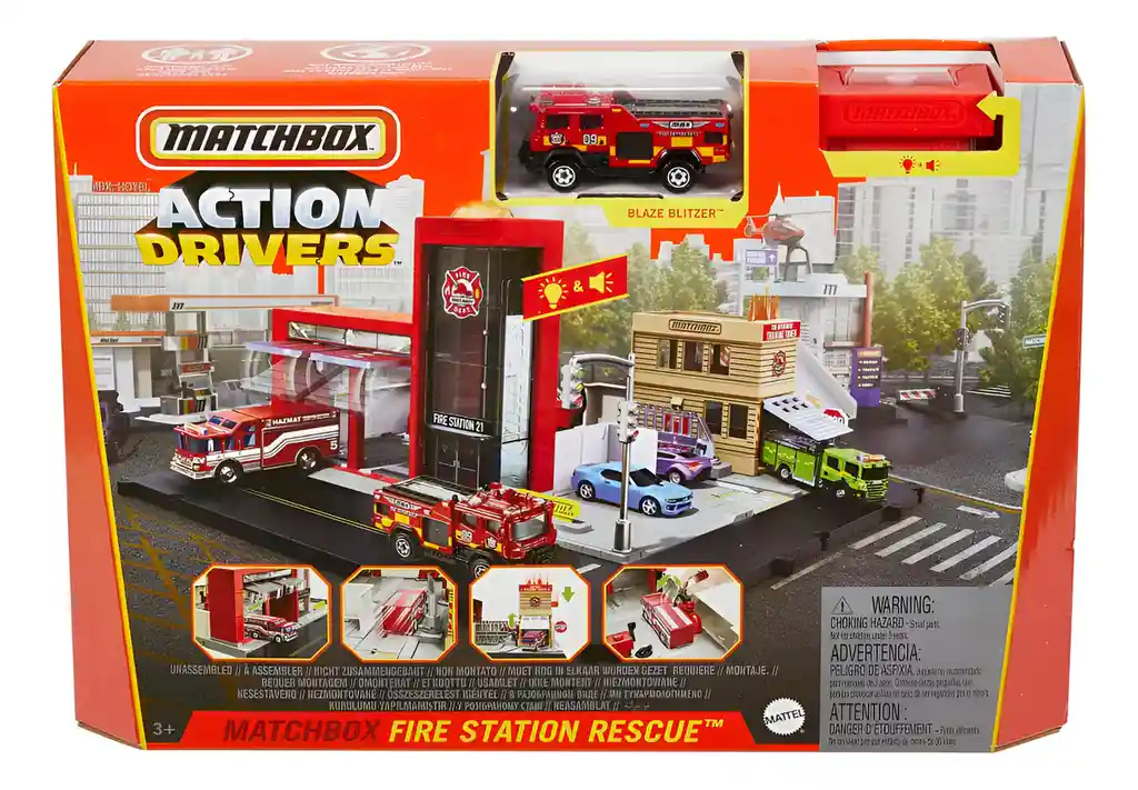 America Store te trae Set Pista Matchbox Action Drivers Coleccion Vehículos De Mattel Fire Station Los Matchbox y Hot Wheels Action Drivers llevan la emoción del juego a otro nivel, combinando detalles realistas, funciones interactivas y la posibilidad de construir una ciudad completa llena de acción. Cada set está diseñado para que los niños se conviertan en verdaderos conductores, viviendo aventuras dinámicas en escenarios que parecen cobrar vida. Cada pista incluye estructuras cuidadosamente diseñadas: gasolineras, talleres mecánicos, restaurantes, estaciones de rescate y mucho más. Los pequeños conductores no solo juegan a correr autos, sino que también experimentan situaciones del día a día, estimulando la imaginación y el juego de roles.