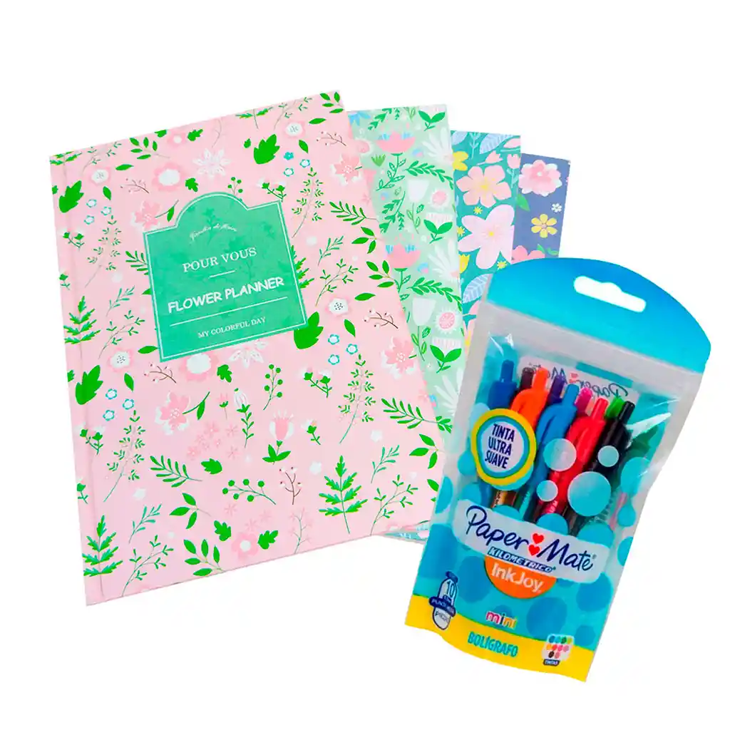 set planeador flower + mini bolígrafos x 10 colores Planeador Semanal y Mensual Pasta Dura Flower Planner Jardín de flores para tí / Planeador semanal y mensual En su interior encontraras hojas con espacios para planear cada semana, o mes, y adicional unas hojas en lineas para que puedas apuntar lo que desees , como tus notas. - Tamaño: 13,5 x 19cm - Hojas internas : Rayadas / Color: Beige - Cantidad hojas : 80 - Borde de hojas exterior color destellos dorados Bolígrafo retráctil Paper Mate InkJoy Mini X 10 Unidades. Tinta brillante de tonos suaves y fuertes en un cuerpo en colores llamativos para que la escritura sea un placer. Los bolígrafos de tamaño que se pueden deslizar fácilmente en los cuadernos y libretas. La tinta de fluidez le permite expresar libremente sus pensamientos y dejar el bolígrafo correr en el papel. La fiabilidad y la suavidad de la punta media de 1 mm permiten te trazar líneas nítidas desde el principio hasta el final. Bolígrafos en diversos colores: rosa, rojo, naranja, verde, azul cielo, azul, morado y café.