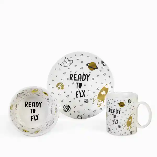 Set Ambiente Gourmet Contiene 3 Unidades. Plato en New Bone China Ideal Para Niños. Viene Con Pocillo y Tazon Hondo Para Sopas y Cremas. Tiene Diseño Divertido de Planetas.