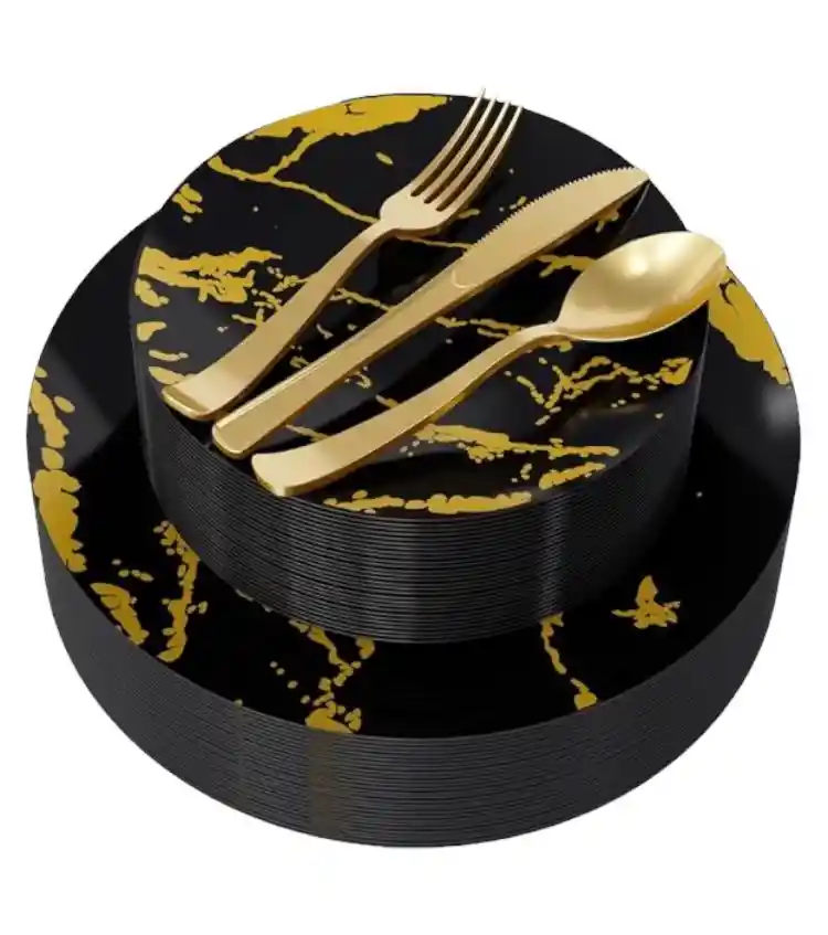 SET DE PLATOS ELEGANTES NEGRO MARMOL , NO INCLUYE CUBIERTOS PLATOS DE CALIDAD ELABORADOS EN PLÁSTICO DURO LIBRE DE BPA, APTO PARA ALIMENTOS. DISEÑO MARMOL MUY ELEGANTE PARA RUS CELEBRACIONES. CONTIENE 6 UNDS DE PLATO 18 CMS Y 6 UNDS DE PLATO 26 CMS