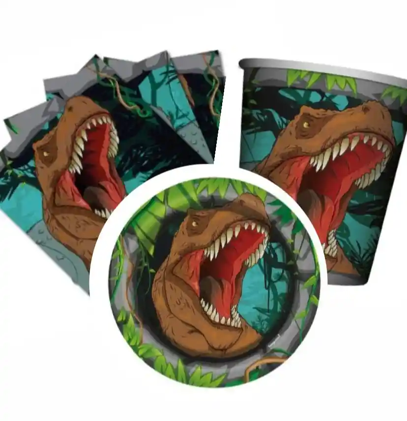 SET PLATOS, VASOS, SERVILLETAS SEMPERTEX DINOSAURIO X8 UNIDADES