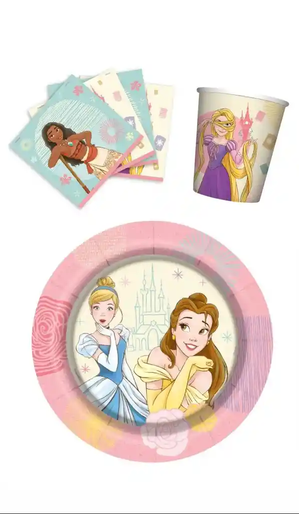 Haz que tu celebración brille con magia y encanto con este set de platos, vasos y servilletas de Princesas. Perfecto para cumpleaños y fiestas temáticas, ideal para niñas que sueñan con un día especial lleno de color, fantasía y alegría. ✨ ✅ Incluye platos, vasos y servilletas para 8 personas 🍽️🥤🧻 ✅ Diseño temático de princesas encantadoras 👸 ✅ Ideal para fiestas infantiles y cumpleaños 🎂 ✅ Material resistente y de un solo uso 💪 ✅ Agrega un toque tierno y elegante a la decoración 💖
