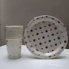 SET PLATOS Y VASOS DISEÑO DE ESTRELLAS DORADAS X 12 UND
