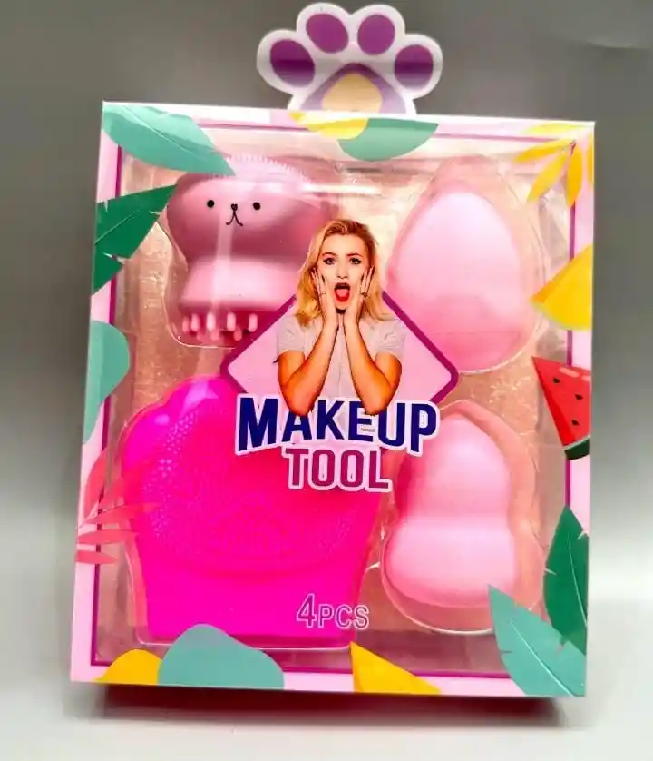 El paquete contiene cuatro piezas, que suelen ser dos esponjas de maquillaje y dos limpiadores o cepillos faciales de silicona, a menudo uno con forma de "pulpo" o con diseño de huella de gato. Estos sets están diseñados para la aplicación de maquillaje, así como para la limpieza y exfoliación facial como parte de una rutina de cuidado de la piel.