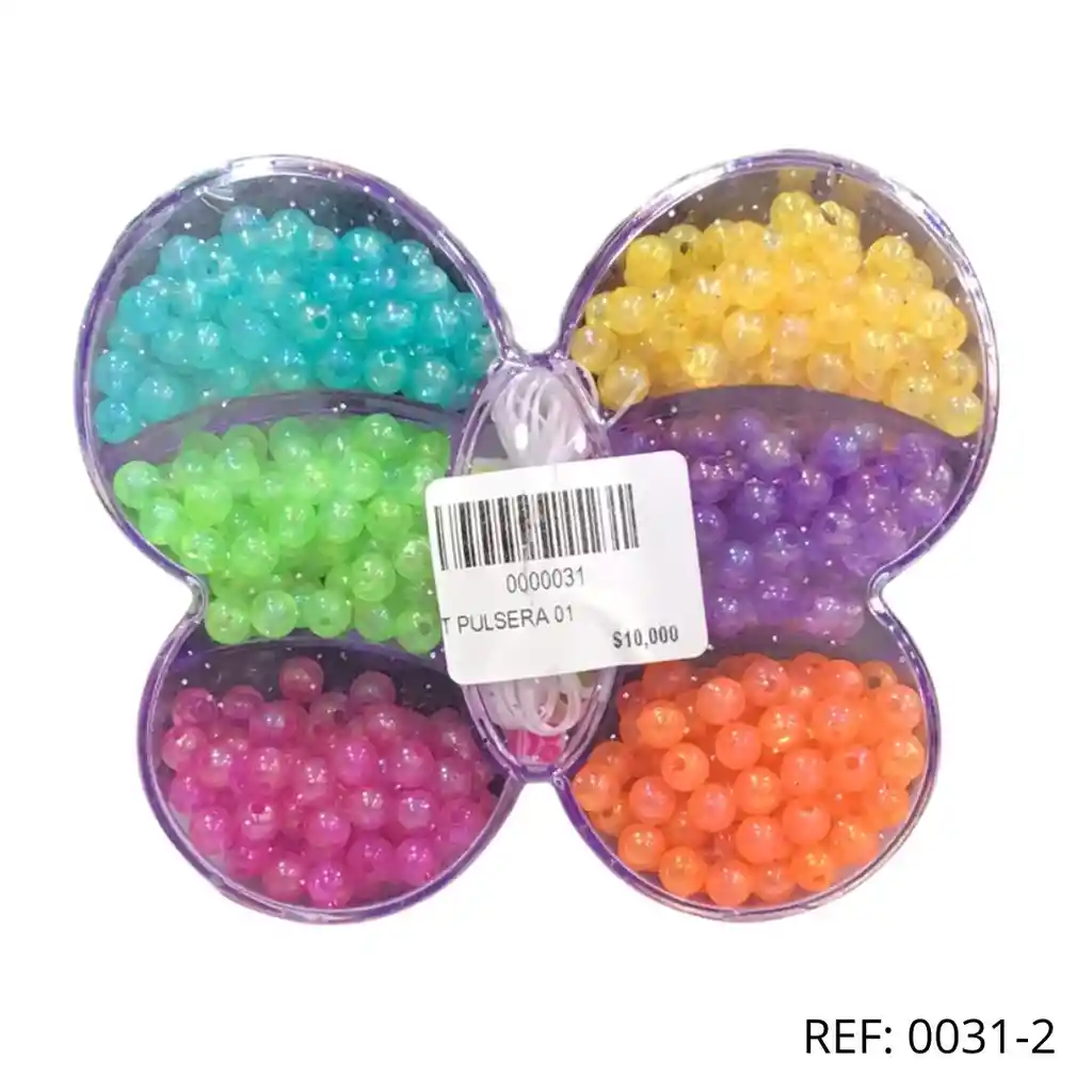 Set para armar pulseras en recipiente con forma de mariposa, incluye cuentas y accesorios coloridos para crear diseños únicos.