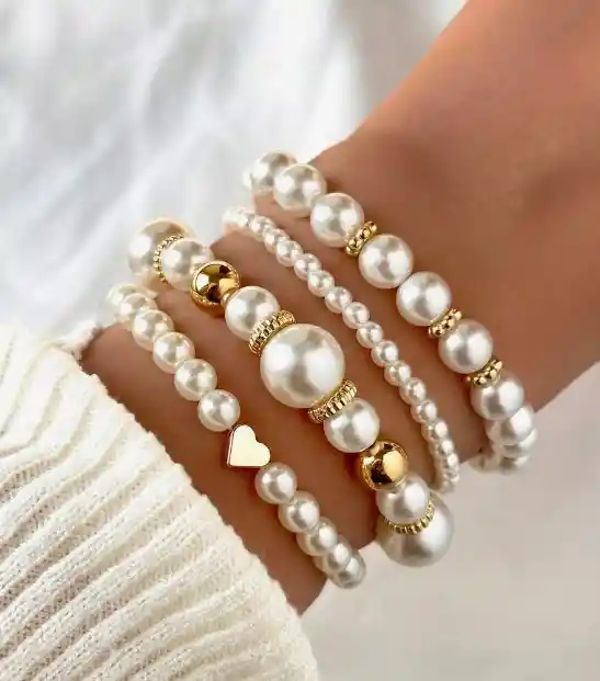 4 Piezas/set Pulsera De Moda De Amor Y Cuentas, Conjunto De Pulseras De Imitación De Perlas Color: Dorado Género: Mujer Material: Cuentas Recubiertas de Cobre