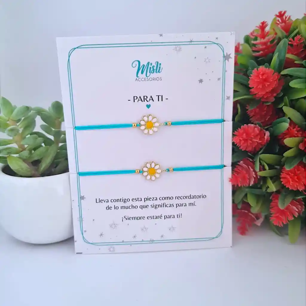 Adéntrate en el mundo de la amistad con nuestro set de pulseras de margaritas. Estas hermosas pulseras no solo son un accesorio elegante, sino que también simbolizan la unión y complicidad. Cada pulsera está meticulosamente diseñada con detalles de margaritas, evocando la frescura y la alegría de la primavera. Comparte el amor con tus personas especiales al regalarles una de estas manillas de amistad. Ya sea que estén juntos o separados, estas pulseras serán un recordatorio constante de los lazos indestructibles que los unen. Celebra la amistad con estilo y significado con nuestro set de pulseras de margaritas: el regalo perfecto para fortalecer los vínculos que perduran para siempre. INCLUYE: -Par de pulseras en hilo con dije de margarita y tarjeta con mensaje. -Precio por 2 unidades. -Ajustables a la muñeca. Nos mantenemos a tu disposición para resolver cualquier consulta o brindarte información adicional que requieras. ¡No dudes en contactarnos, estamos para ayudarte en todo lo que necesites!