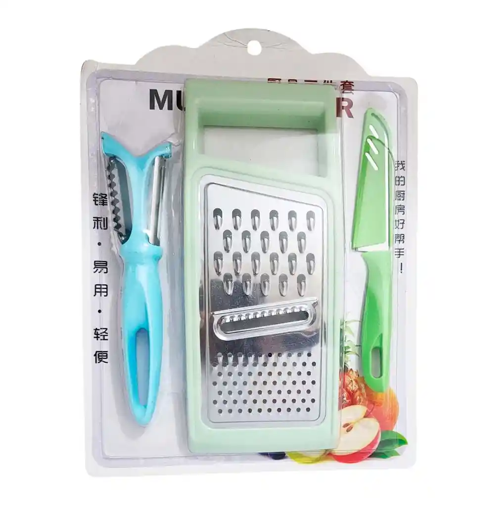 Práctico set de cocina de 3 piezas que incluye rallador multifuncional, pelador y cuchillo, todos con mangos ergonómicos que facilitan su uso y brindan comodidad; ideal para realizar tareas básicas como rallar, pelar y cortar frutas o verduras de manera rápida, sencilla y segura en el hogar. Ficha Técnica: Dimensiones : 31 cm x 23 cm x 3 cm Material: Acero Inoxidable / Plastico Referencia: 826 ** _Para defectos de fábrica o retractos: \_Por favor revise el producto apenas lo reciba y antes de usarlo. No aplican ley de retracto o defectos de fábrica luego de usar el producto. Se manejan máximo 5 días para reportar defectos de fábrica (por ejemplo, producto funciona mal, piezas faltantes, rotas, etc). Para hacer efectiva la devolución el producto debe devolverse con el empaque original, el cual debe estar en buen estado, incluir todos los documentos y las partes completas y sin daños.