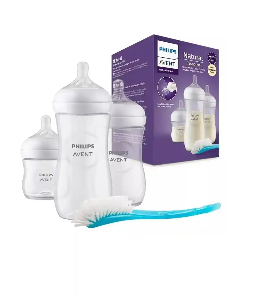 Este set de regalo para recién nacidos es el inicio perfecto para la alimentación y calmar a su bebé. Con la tetina de respuesta natural, los bebés pueden alimentarse a su propio ritmo como en el pecho, lo que facilita la combinación de la lactancia materna y el biberón. La tetina libera leche cuando el bebé traga de forma activa La tetina de respuesta natural coopera con el ritmo de alimentación natural del bebé, lo que permite combinar la lactancia materna y la alimentación con biberón con facilidad. La tetina tiene una abertura única que solo libera leche cuando el bebé traga de forma activa. Por lo tanto, cuando hace una pausa para tragar y respirar, el flujo de leche también se detiene. Sujeción natural con tetina en forma de pecho La tetina ancha, suave y flexible está diseñada para imitar la forma y la sensación de un pecho, lo que ayuda a que el bebé se sujete de forma natural y se alimente cómodamente. Diseñado para reducir cólicos y malestares La válvula anticólicos está diseñada para mantener el aire alejado de la pancita del bebé durante la alimentación, a fin de ayudar a reducir los cólicos y los malestares. Que incluye tu compra? 1 tetero natural 4 oz con tetina 0m+ 2 Goticas 1 tetero natural 9oz con tetina 1m+ 3 goticas 1 tetero natural 11 oz con tetina 3m+ 4 goticas Escobilla