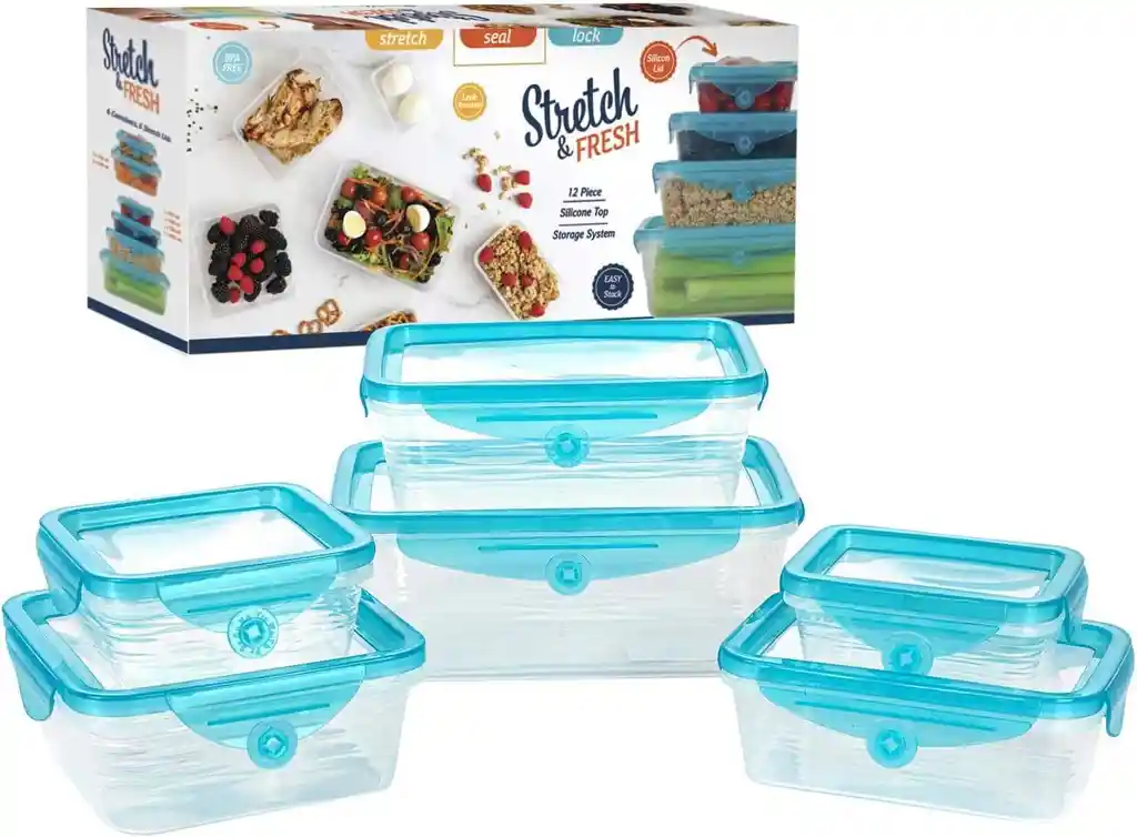 Juego de recipientes de alimentos a prueba de fugas y apilables tapas siliconadas .RESISTENTE A LAS FUGAS: Stretch and Fresh es el sorprendente y nuevo recipiente de almacenamiento de alimentos que utiliza tapas forradas de silicona de grado alimenticio para cerrar la humedad y eliminar la oxidación del aire, sellando la frescura y permitiendo que los alimentos duren más que el tradicional plástico transparente y otros recipientes estándar de almacenamiento de alimentos. Apto para congelador, microondas y lavavajillas: Stretch and Fresh ayuda a evitar que los alimentos se quemen en el congelador. Ahora puedes preparar comidas, guardarlas en el congelador para su consumo posterior, sacarlas cuando las necesites, calentarlas en el microondas . Apilable para un fácil almacenamiento: ¿estás familiarizado con las tapas que faltan o las piezas de contenedores que no coinciden? A diferencia de la mayoría de los sistemas de almacenamiento de alimentos que existen, el Stretch and organizada Piezas y tamaños incluidos: Rectángulo-XL 8.25 pulgadas x 5.5 pulgadas x 3.25 Rectángulo-Grande 7 pulgadas x 4.7 pulgadas x 2.75 pulgadas Rectángulo-Mediano 6 pulgadas x 4 pulgadas x 2.25 pulgadas Rectángulo-Pequeño 4.5 pulgadas x 3.2 pulgadas x 1.25 pulgadas cuadrado-grande 5.75 pulgadas. 5.1 in x 5.1 in 75 x 2.5 pulgadas cuadrado: pequeño 4.7 x 4.7 x 2 pulgadas Sin BPA: prepara y disfruta de comidas saludables con nuestros recipientes de almacenamiento de alimentos sin BPA, y mantenlos frescos usando Fresh and Stretch sabiendo que durarán más tiempo.