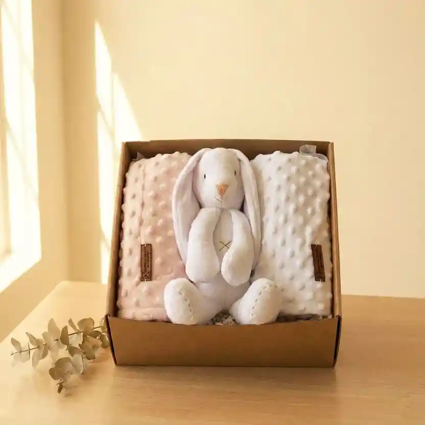 Set regalo para bebé con conejito de peluche y mantas suaves Este delicado set regalo para bebé incluye un tierno conejito de peluche blanco y dos mantas ultra suaves en tonos rosa y blanco, presentados en una caja kraft lista para regalar. Es el detalle perfecto para baby shower, recién nacidos, bautizos y primeros meses del bebé. Mantas suaves para recién nacido Las mantas están confeccionadas en una tela tipo minky con textura de lunares en relieve, ideal para mantener al bebé abrigado y cómodo en la cuna, coche o sillita. Sus colores neutros y delicados combinan fácilmente con cualquier habitación infantil. Conejo de peluche tierno y abrazable El conejito de peluche es ligero, suave y de diseño minimalista, pensado para acompañar al bebé en sus primeros momentos de juego y descanso. Su tamaño es perfecto para que las pequeñas manos lo puedan abrazar con facilidad. Características del set regalo Incluye 1 conejito de peluche blanco y 2 mantas suaves (rosa y blanca). Presentación en caja kraft lista para entregar como regalo. Texturas suaves y agradables al tacto, ideales para pieles delicadas. Colores neutros y elegantes, perfectos para niña o niño. Ideal para baby shower, nacimiento, bautizo o visita a la clínica. Un detalle especial de Expresionarte.co Este set de conejito y mantas para bebé está pensado para sorprender a los nuevos padres con un regalo útil, tierno y memorable, que acompañe los primeros meses del pequeño con calidez y amor.