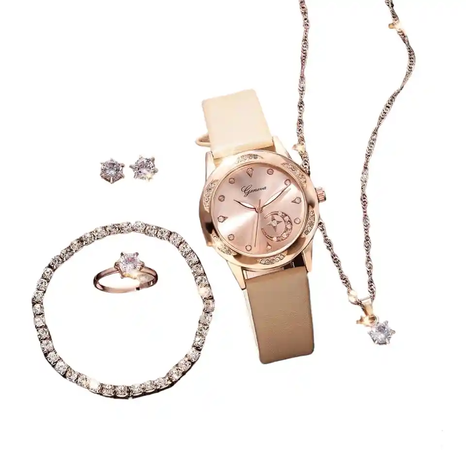 Set Reloj Para Mujer Beige + Collar Aretes Pulsera Lindo kit de reloj para dama con accesorios, ideal para un buen detalle El kit contiene: 1 reloj para mujer con correa en color beige cuero sintético, sistema análogo en su pantalla movimiento cuarzo. INCLUYE 1 juego de collar 1 par de aretes 1 anillo 1 pulsera ajustable color: dorado Elaborados en aleación de metal. se recomienda no aplicar cremas directamente, ni perfume para su máximo cuidado y durabilidad. Todo kit se entrega en caja