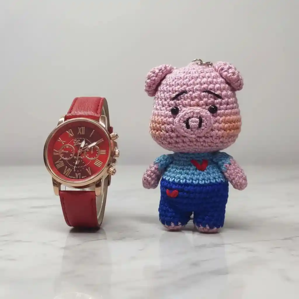 l Set Reloj Para Mujer Con Llavero Amigurumi de VANIDADES COLLECTIONS es la combinación perfecta de estilo y funcionalidad. Con un diseño elegante y moderno, este reloj presenta una caja redonda de color plateado que resalta su sofisticación. La correa de cuero sintético proporciona comodidad y durabilidad, ideal para el uso diario. El movimiento de cuarzo garantiza precisión en la hora, mientras que su pantalla analógica añade un toque clásico a tu look. Este set incluye un encantador llavero amigurumi, que no solo es un accesorio divertido, sino también una excelente manera de expresar tu personalidad. Con un peso ligero de 30 kg, es fácil de llevar y se adapta a cualquier ocasión, desde una salida casual hasta un evento más formal. Aunque no es resistente al agua ni apto para buceo, su diseño atemporal lo convierte en un complemento versátil para tu colección de accesorios. El cierre de hebilla simple asegura un ajuste cómodo y seguro en tu muñeca. Este set es una opción ideal para mujeres que buscan un accesorio que bine elegancia y originalidad, perfecto para regalar o para consentirte a ti misma.