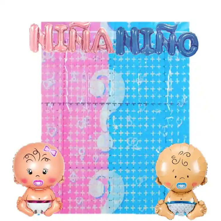 Set revelacion de genero contenido 1 cortina de cuadros Rosa y azul ( 1 metro de ancho- 2 metros de largo) 1 Globo de 45 cm bebe niña 1 Globo de 45 cm bebe niño 1 globo palabra niña 1 Globo palabra niño Globos se envian sin inflar disponiblidad inemdiata