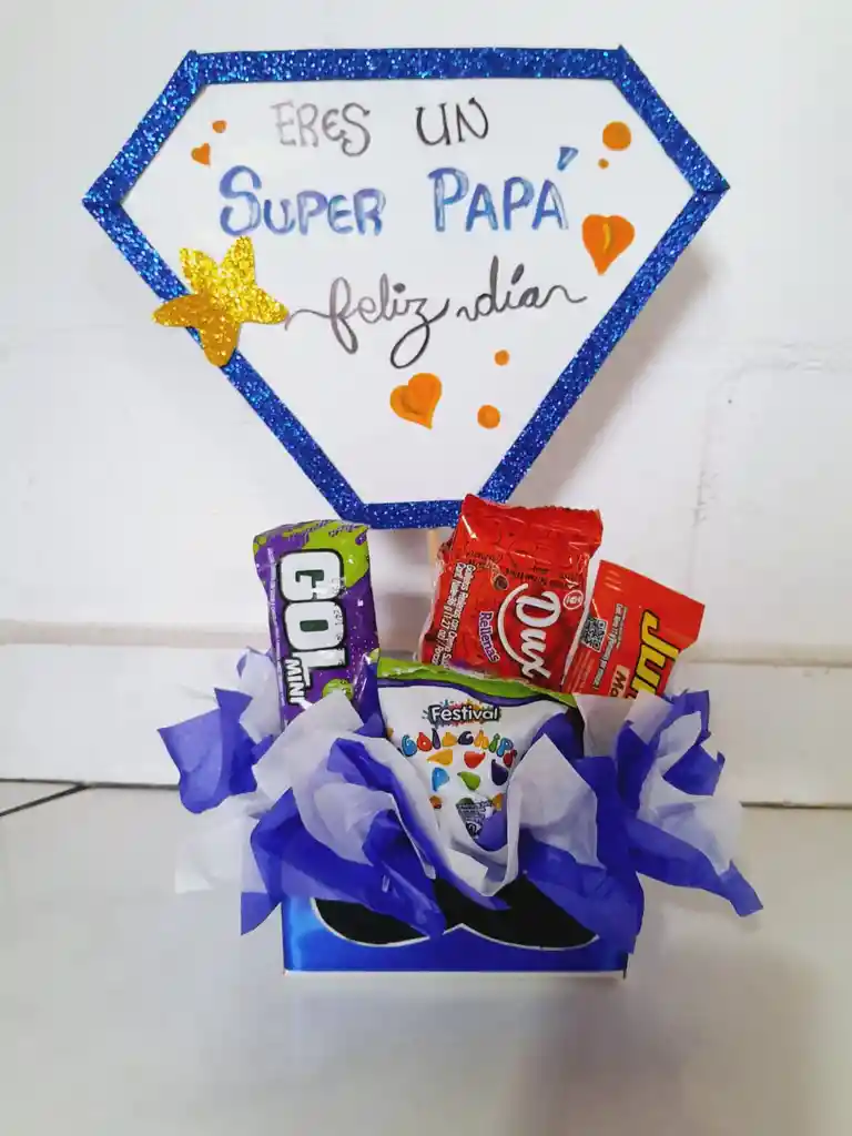 1 CAJITA CON : 1 GALLETA MINIGOL,1 GALLETA RELLENA DE CHOCOLATE DUX, 1 MINI CHOCOLATINA JUMBO MANI,1 GOLOCHIPS DE FESTIVAL, CON SU RESPECTIVA TARJETA DE FELICITACIONES DEL DIA DEL PADRE.