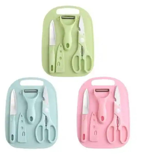 Todo lo que necesitas para tus preparaciones en la cocina. Este práctico set de cocina incluye una tabla de picar, cuchillo con funda, pelador y tijera, combinando funcionalidad y diseño para facilitar todas tus tareas culinarias.