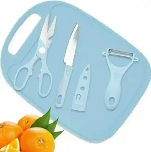 Tabla de picar con ranuras: Diseñada para recoger los jugos de frutas, carnes y vegetales, manteniendo tu cocina limpia y organizada. Cuchillo de acero inoxidable: Con funda protectora para mayor seguridad y durabilidad, ideal para todo tipo de cortes. Pelador ergonómico: Perfecto para pelar frutas y vegetales con facilidad y precisión. Tijera multifuncional: Resistente y versátil, adecuada para cortar carnes, hierbas, paquetes y más. Materiales de alta calidad: Fabricado en ABS duradero y acero inoxidable, asegurando una larga vida útil y resistencia al uso diario. Especificaciones: Material: ABS y acero inoxidable. Incluye: 1 tabla de picar con ranuras para jugos. 1 cuchillo con funda protectora. 1 pelador ergonómico. 1 tijera de cocina multifuncional. Ventajas: Práctico y completo: Todo lo que necesitas en un solo set para realizar cortes y preparaciones rápidas y precisas.