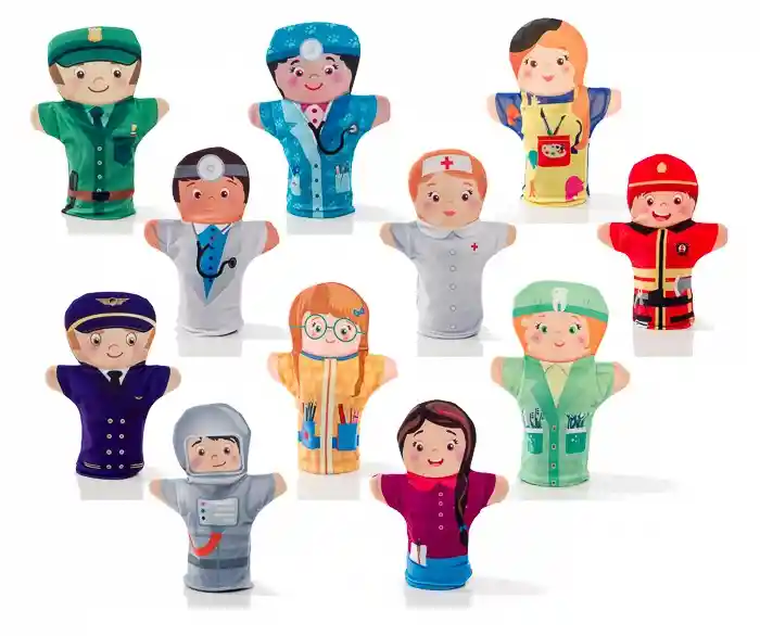 Set de títeres que contiene 14 profesiones representativas. Edad 2+