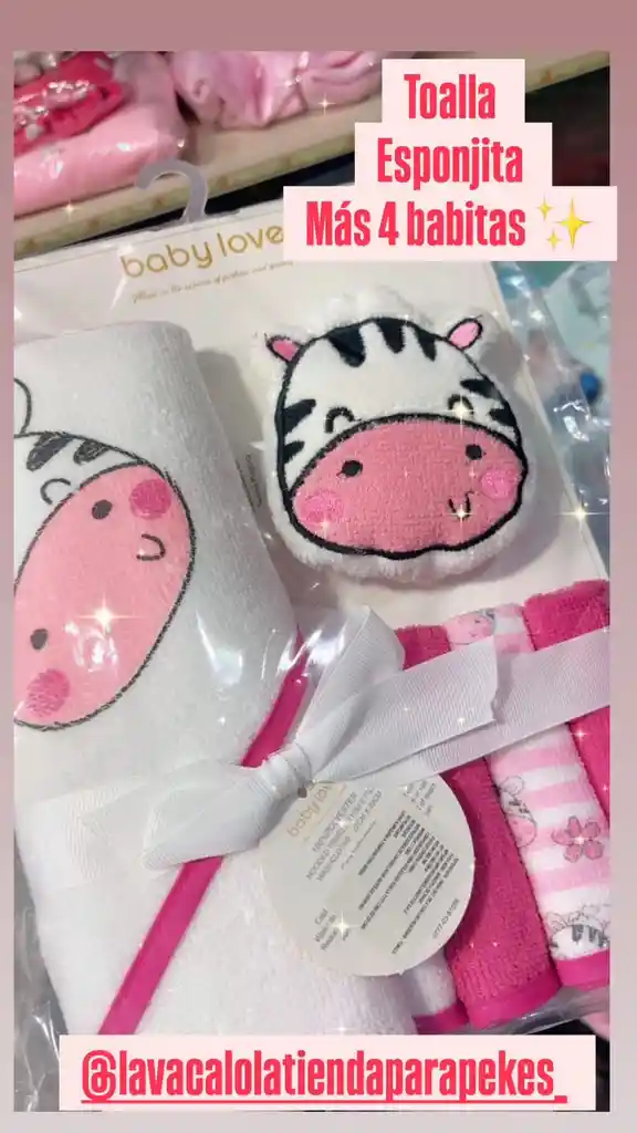 Incluye toalla 71 cm x 71 cm 100% polyester más 4 babitas 22 cm x 22 cm y esponjita para el baño