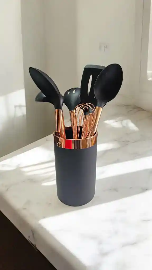 Equipo completo - el elegante juego de utensilios de cocina le ofrece todo lo que necesita para el trabajo diario en la cocina; espátula, batidor y mucho más solo en un paquete Sólido y duradero - el juego de utensilios domésticos está fabricado en acero inoxidable de alta calidad (tanto el soporte como los mangos); las cabezas de los utensilios están hechas de material de silicona duradero Diseño esencial e inteligente - el juego de utensilios de cocina impresiona por su diseño elegante y atractivo; gracias a los cabezales de silicona inteligentes, arañar las ollas y sartenes es cosa del pasado